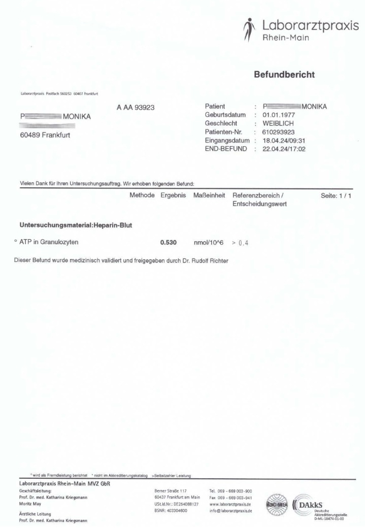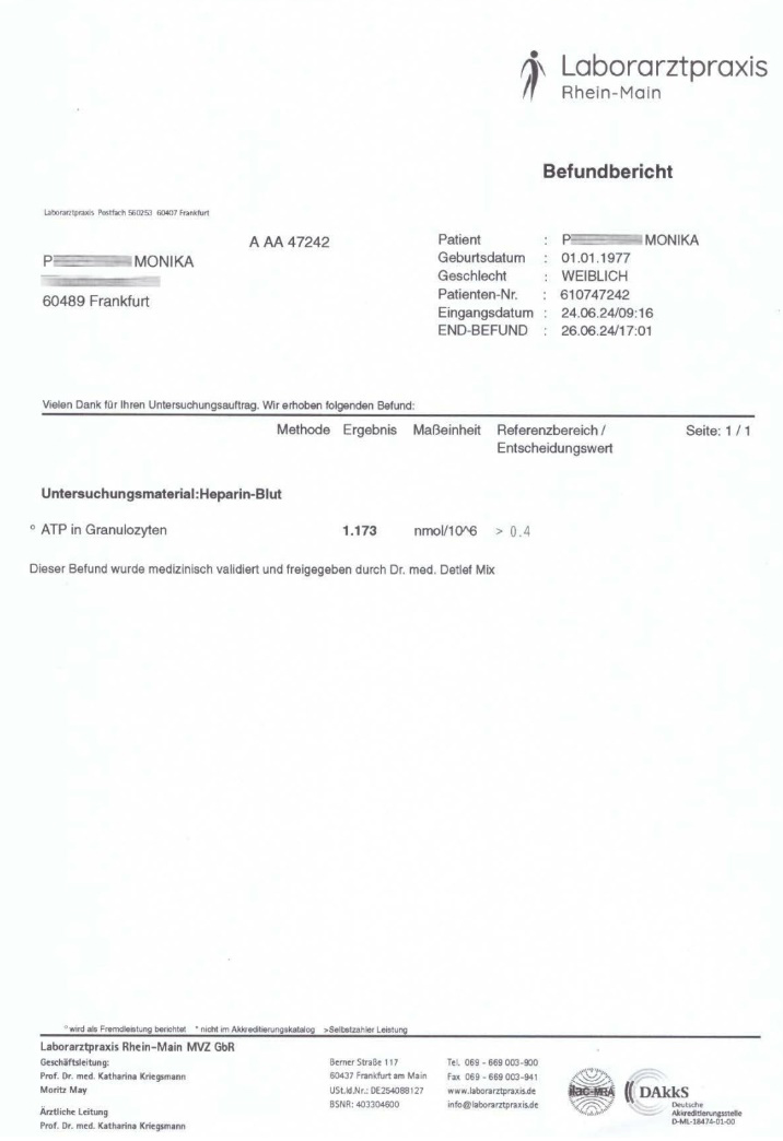In a study conducted on April 22, 2024, in men, the apparent ATP level in granulocytes was 0.254 nmol. After 2 months of treatment with the preparation, the ATP level increased to 0.522 nmol, i.e. by 105.5%.
