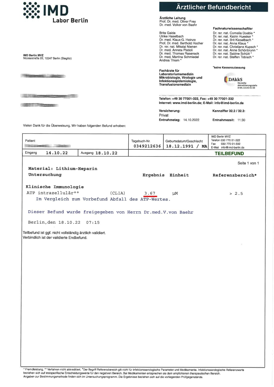 The intracellular ATP level at the beginning of the study was 2.79 µM (lower reference range).