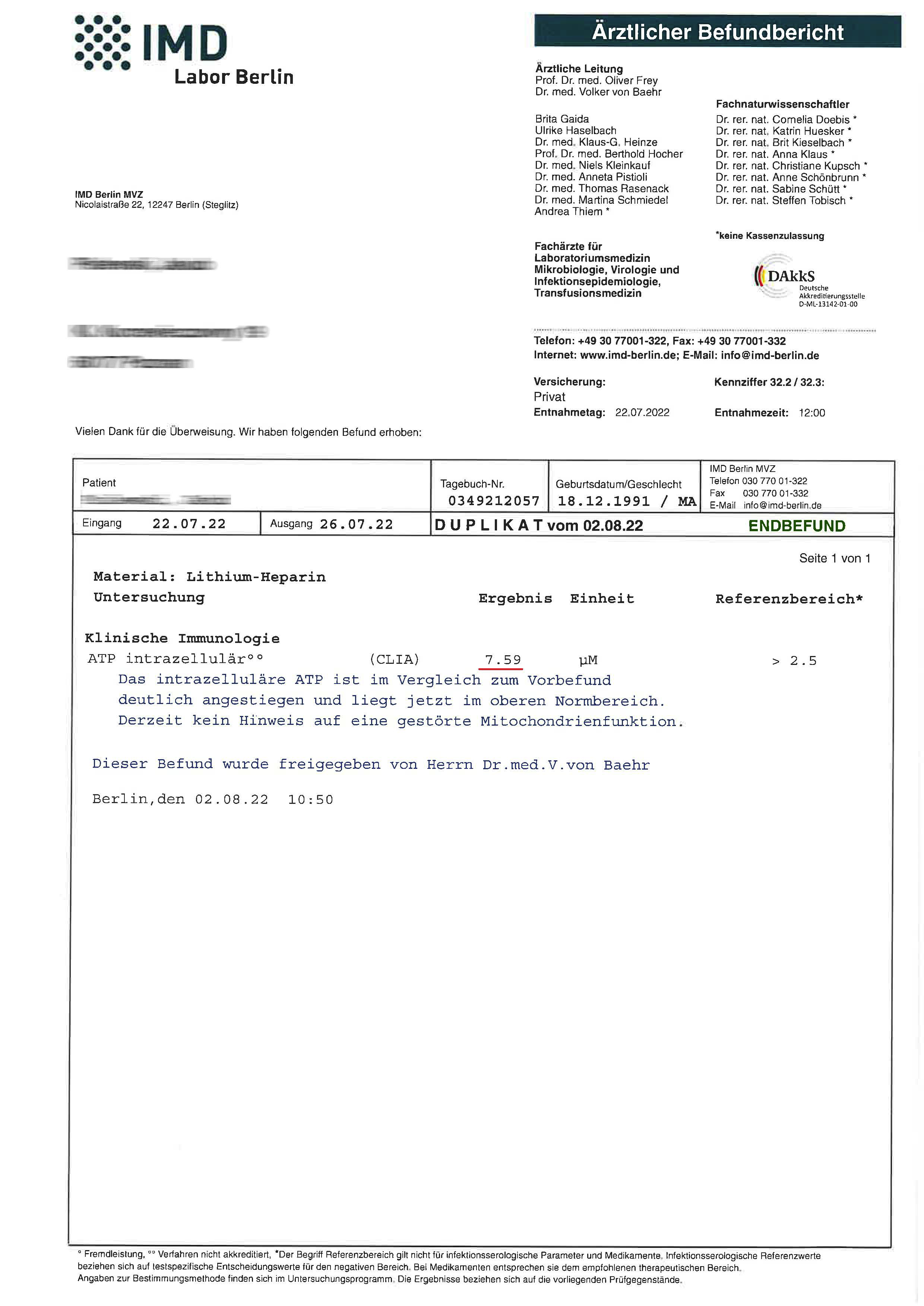 The ATP level after discontinuing the preparation for the next 6 weeks was 3.67 µM (the preparation was not taken from July 22, 2022, to October 14, 2022). The measurement demonstrated that the effects achieved during treatment with the preparation are sustained mitochondrial stimulation, which, in the case of pathological conditions, indicates the effectiveness of limiting and eliminating changes.