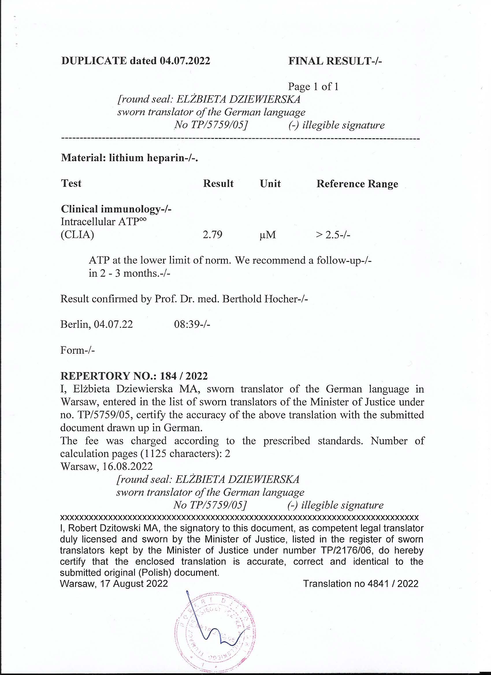 The intracellular ATP level at the beginning of the study was 2.79 µM (lower reference range). After approximately 6 weeks of using the preparation, a significant increase in intercellular ATP was observed, reaching 7.59 µM (upper reference range; additionally, no mitochondrial dysfunction was observed). This increase in ATP confirms mitochondrial stimulation and provides evidence of the effectiveness of oral administration of the preparation. On the day of the study, a daily dose of the preparation (50 ml) was also administered.