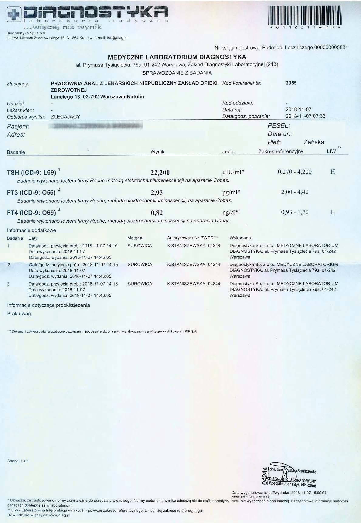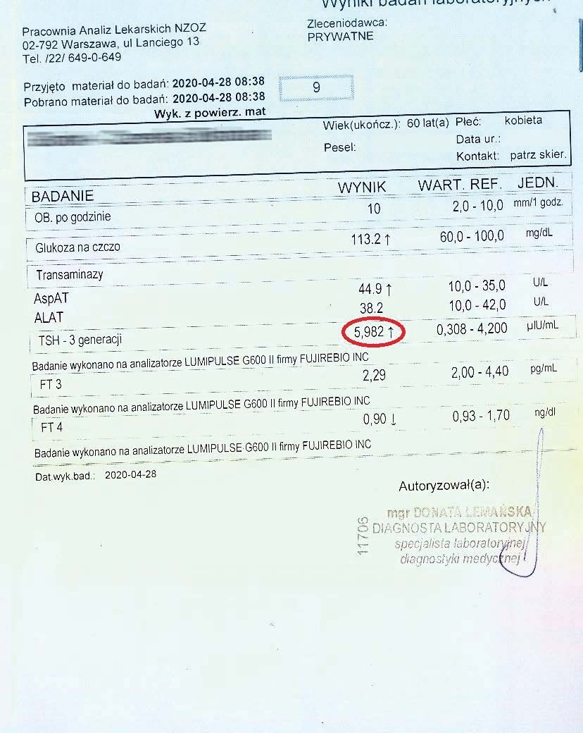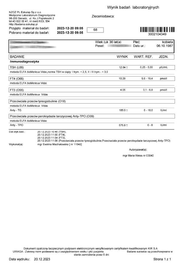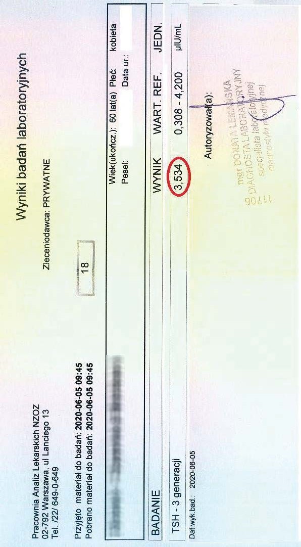 A 36-year-old woman began treatment with the product due to deteriorating well-being and high TSH and anti-TPO levels, clearly indicating hypothyroidism. Levothyroxine was not used. After just 12 days of using the product, a significant decrease in thyroid parameters and antibodies was noted.