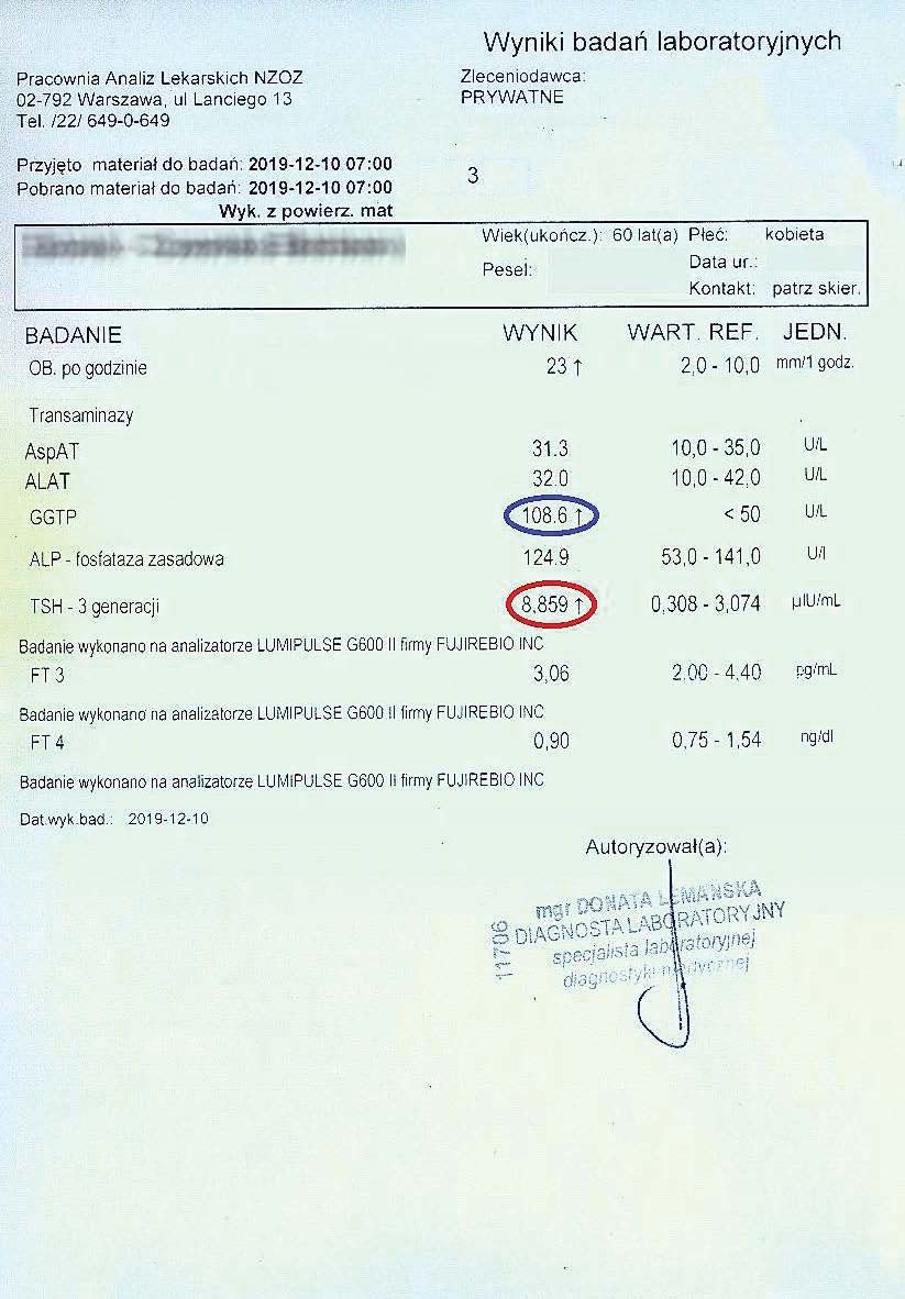 After another two months, the woman had her tests performed again. A decrease in TSH, reduced inflammation, and a decrease in the liver marker GGTP were visible.