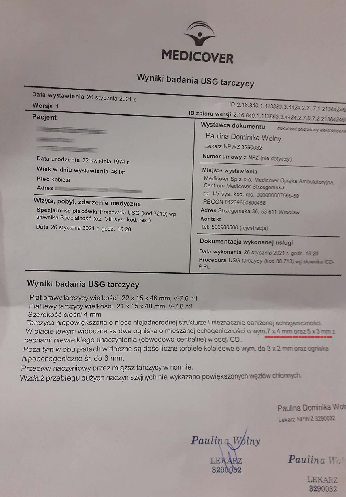 A 46-year-old woman was diagnosed with thyroid nodules measuring 9x4 mm and 5x8 mm before receiving the product. After just one month of treatment without additional medication, the nodules decreased to 7x4 mm and 5x3 mm. The rapid reduction of nodules (~20-65%) without surgical or pharmacological intervention indicates cellular repair at the mitochondrial level, which prevents abnormal cell division and tumor development. The product increases mitochondrial efficiency in ATP production, stimulating apoptosis of damaged cells while simultaneously promoting regeneration and the formation of healthy structures. This is particularly valuable in the case of benign tumors, where the standard procedure is merely to observe changes, which often leads to the development of much more difficult-to-manage abnormalities.