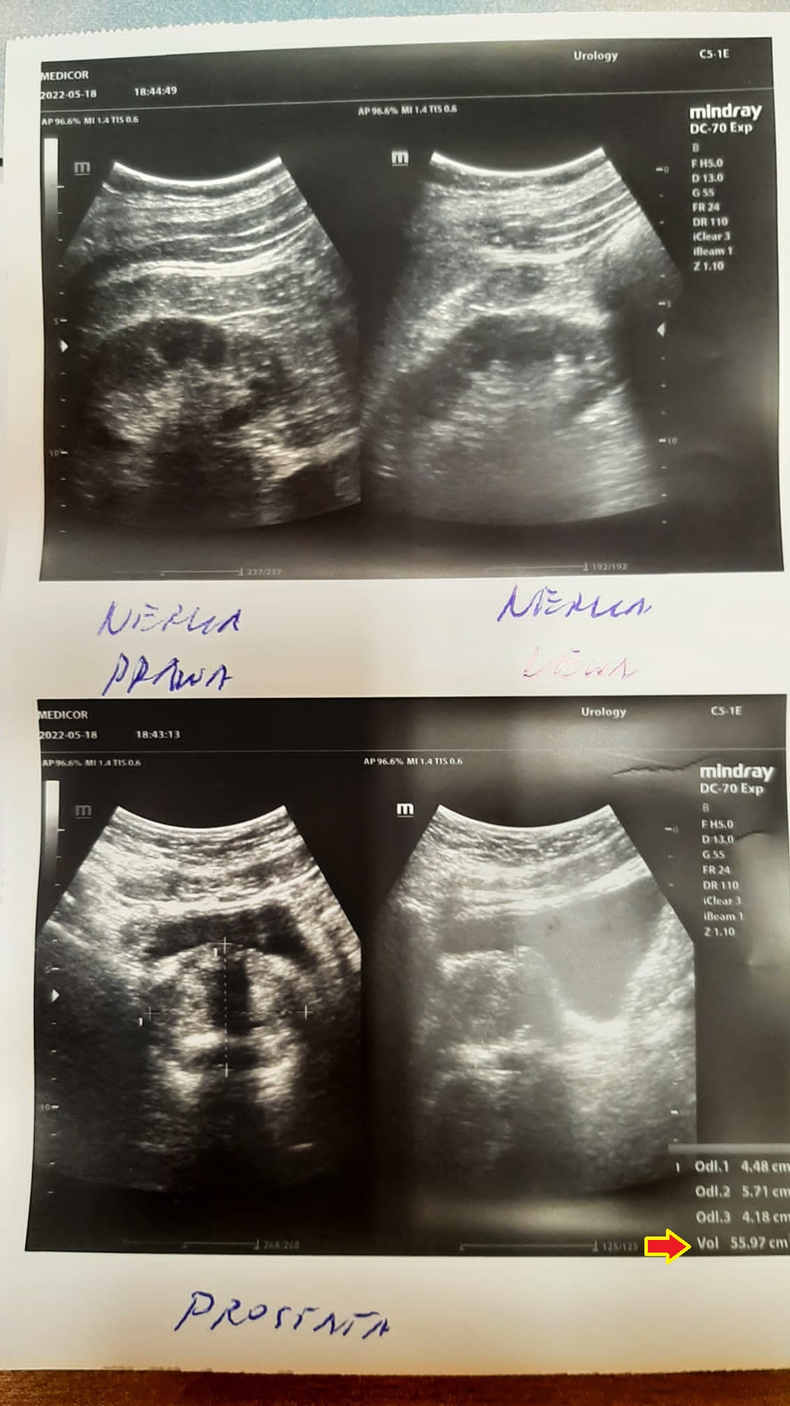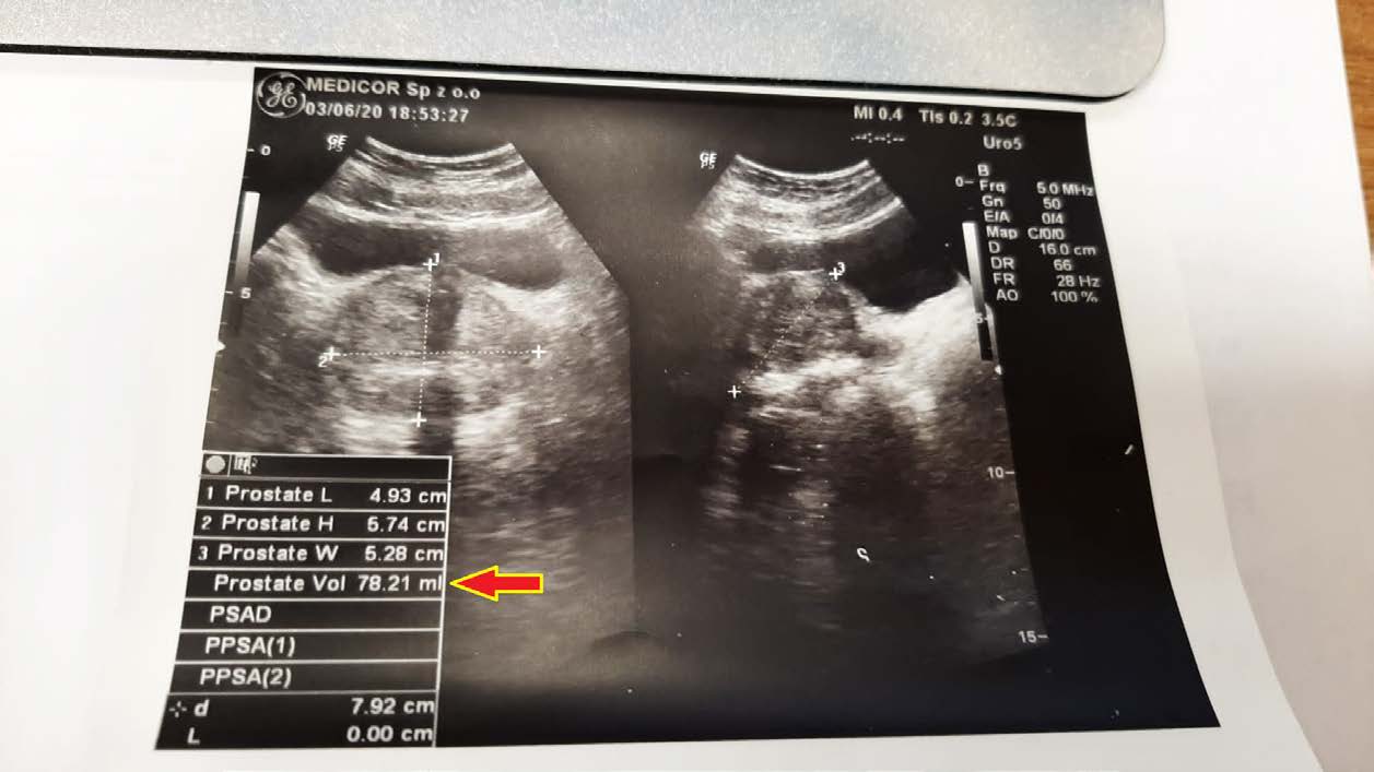 A 50-year-old man with an enlarged prostate, although mild hyperplasia, experienced pain and discomfort when urinating. His prostate volume at diagnosis was 78.21 ml (78.21 cm3). After unsuccessful attempts with finasteride, an attempt was made to reduce the size of the prostate with a drug. As seen in follow-up ultrasound images, the reduction was significant, reaching 55.97 ml (55.97 cm3) after just 2.5 months of therapy.