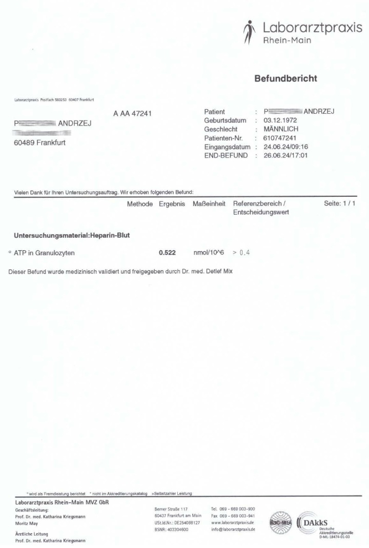 In a study conducted on April 22, 2024, in men, the apparent ATP level in granulocytes was 0.254 nmol. After 2 months of treatment with the preparation, the ATP level increased to 0.522 nmol, i.e. by 105.5%.