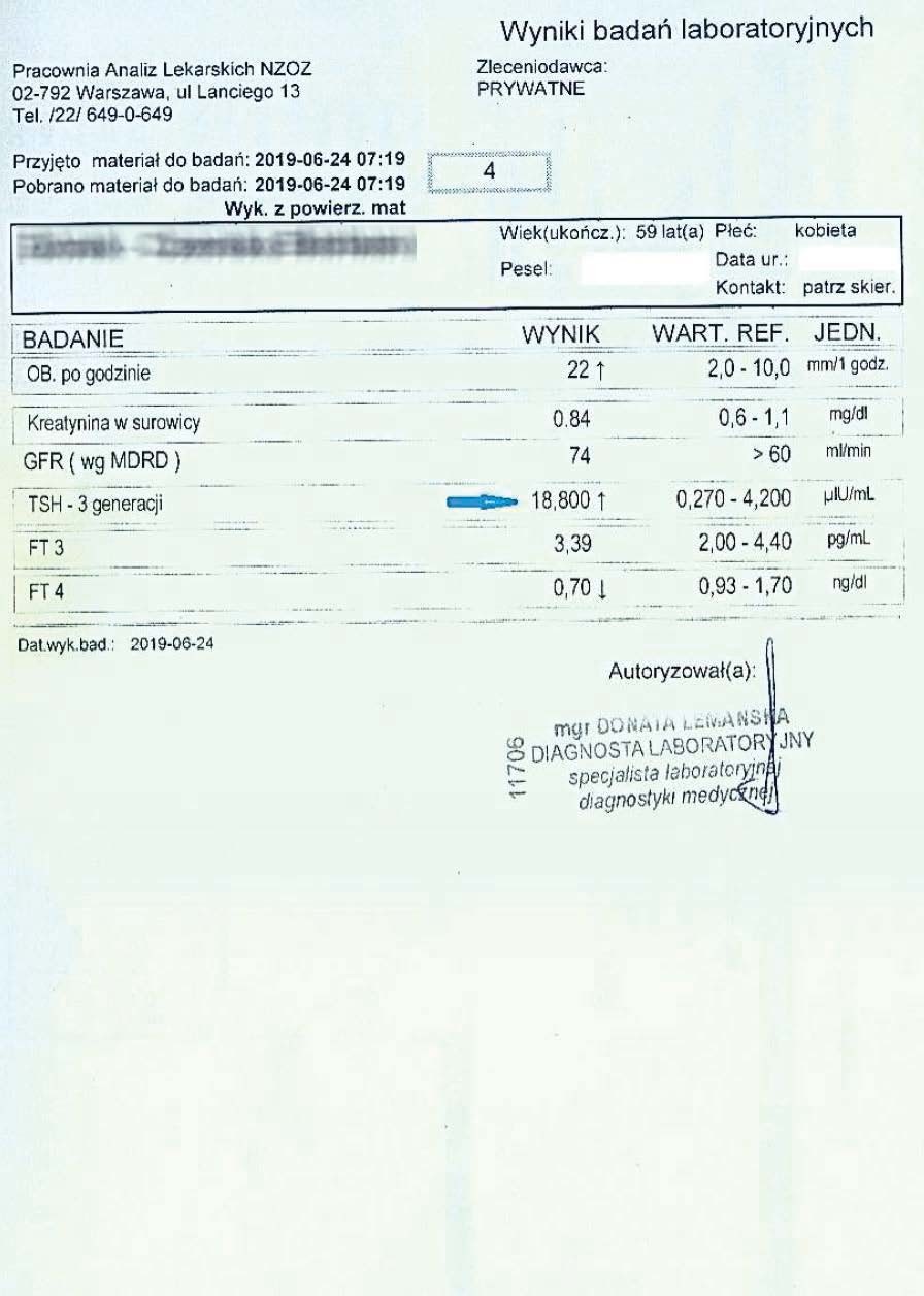 A 59-year-old woman with hypothyroidism, not taking levothyroxine. She took the preparation for over 3 months. While maintaining the natural cell cycle and constantly stimulating mitochondria, she achieved the following treatment results: