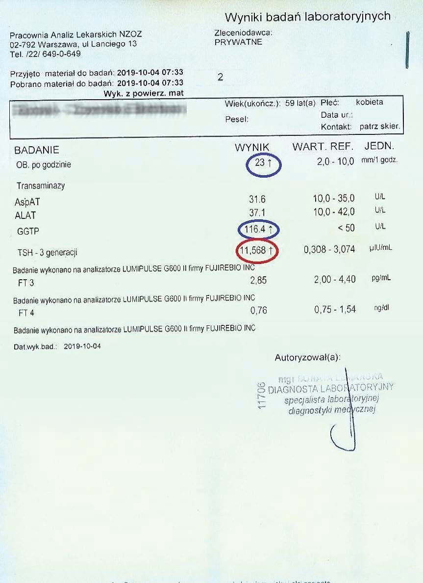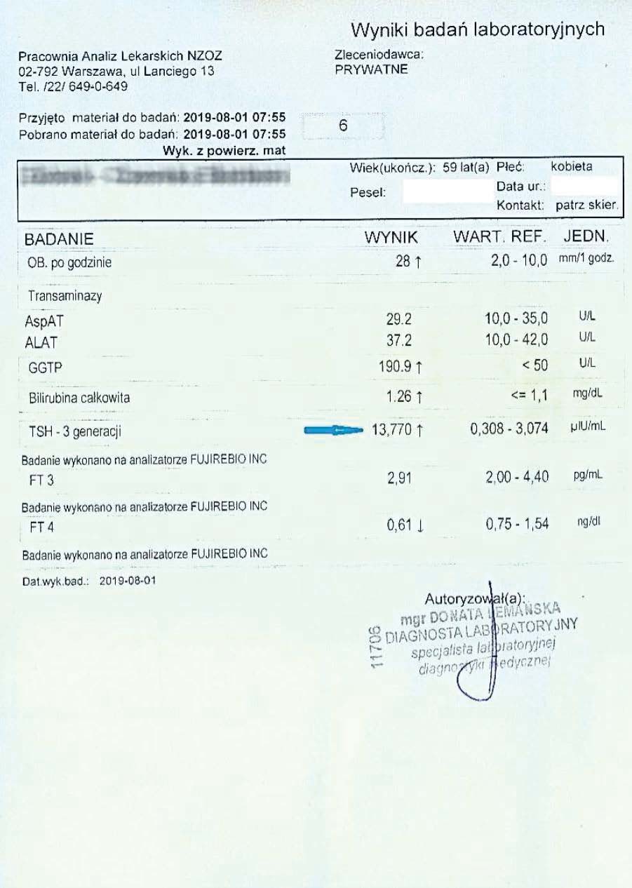 After another two months, the woman had her tests performed again. A decrease in TSH, reduced inflammation, and a decrease in the liver marker GGTP were visible.