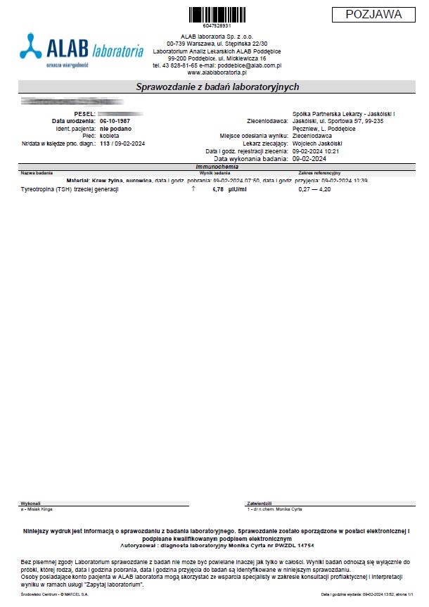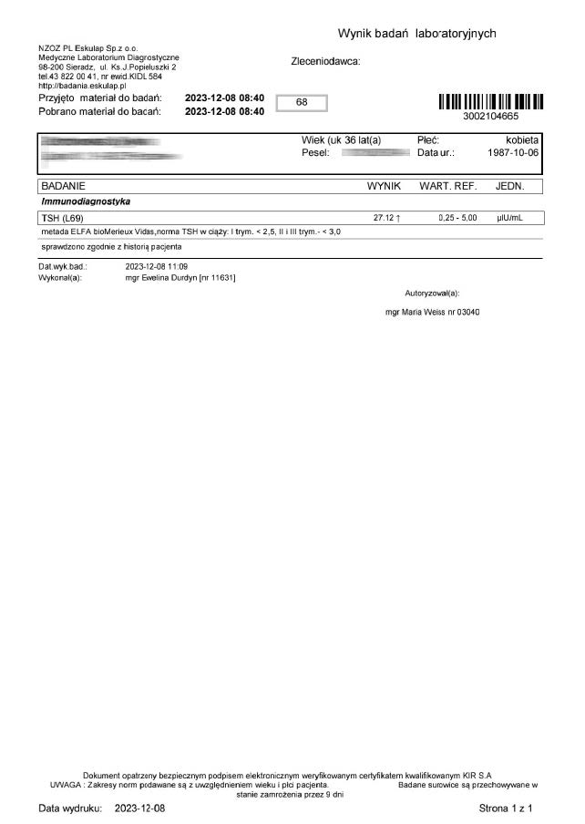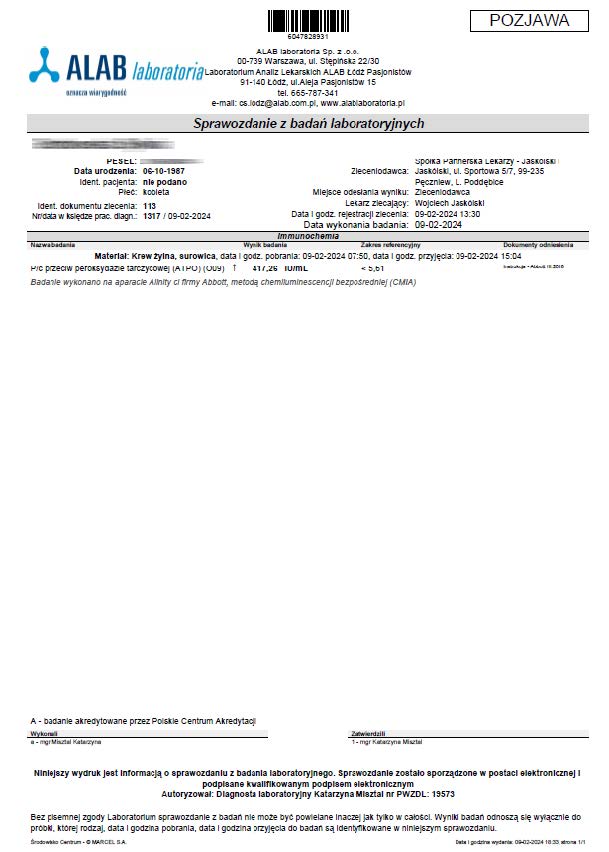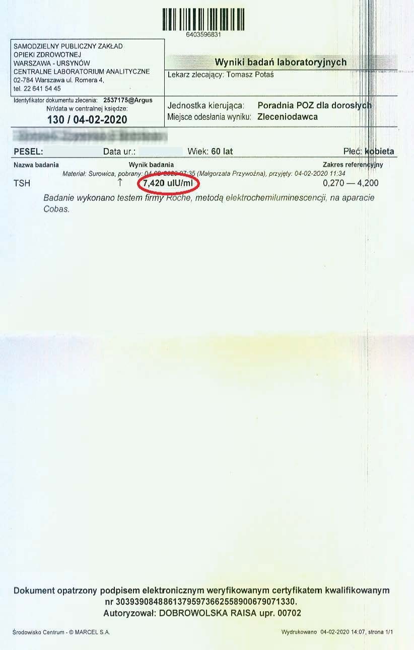 A 36-year-old woman began treatment with the product due to deteriorating well-being and high TSH and anti-TPO levels, clearly indicating hypothyroidism. Levothyroxine was not used. After just 12 days of using the product, a significant decrease in thyroid parameters and antibodies was noted.