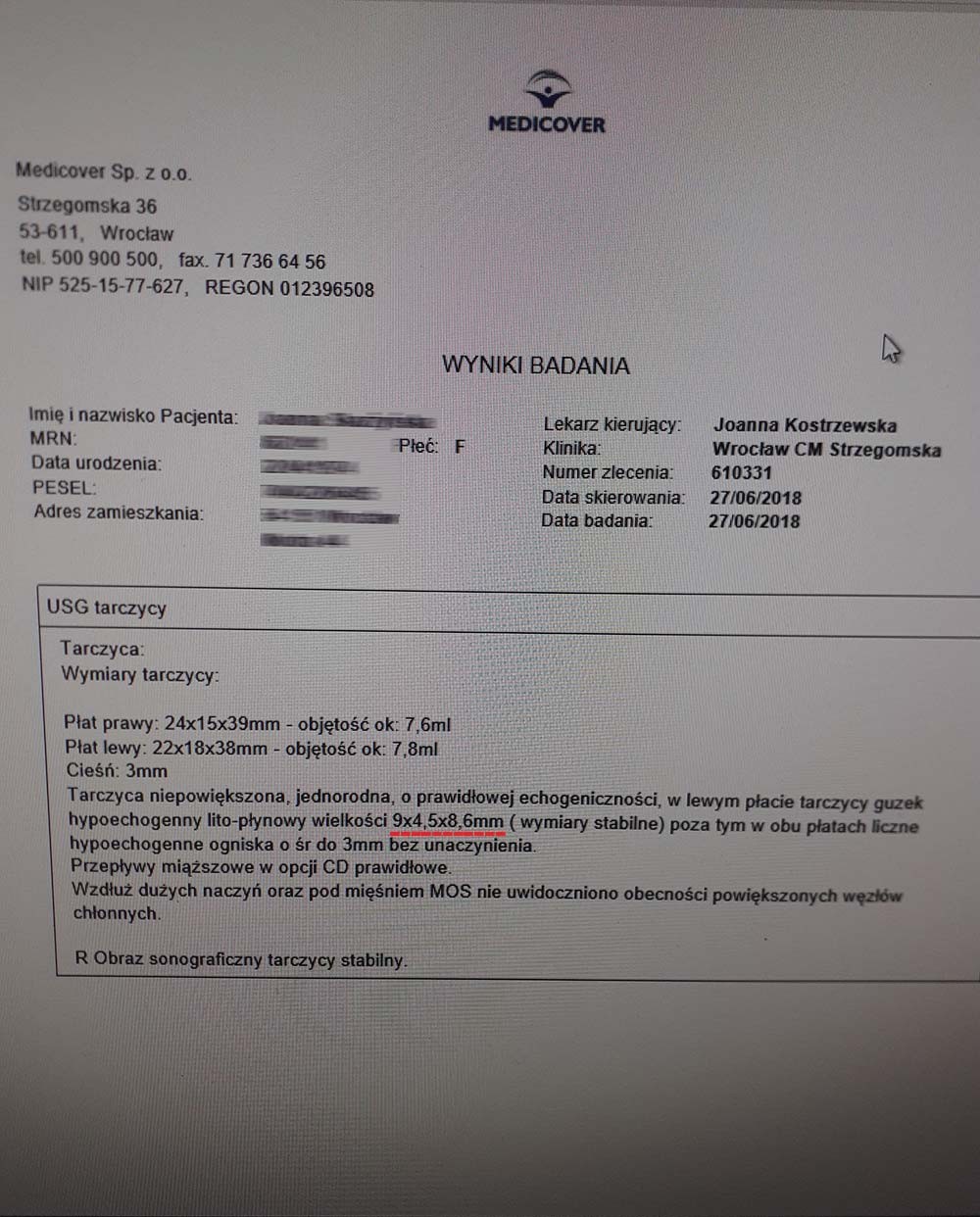 A 46-year-old woman was diagnosed with thyroid nodules measuring 9x4 mm and 5x8 mm before receiving the product. After just one month of treatment without additional medication, the nodules decreased to 7x4 mm and 5x3 mm. The rapid reduction of nodules (~20-65%) without surgical or pharmacological intervention indicates cellular repair at the mitochondrial level, which prevents abnormal cell division and tumor development. The product increases mitochondrial efficiency in ATP production, stimulating apoptosis of damaged cells while simultaneously promoting regeneration and the formation of healthy structures. This is particularly valuable in the case of benign tumors, where the standard procedure is merely to observe changes, which often leads to the development of much more difficult-to-manage abnormalities.